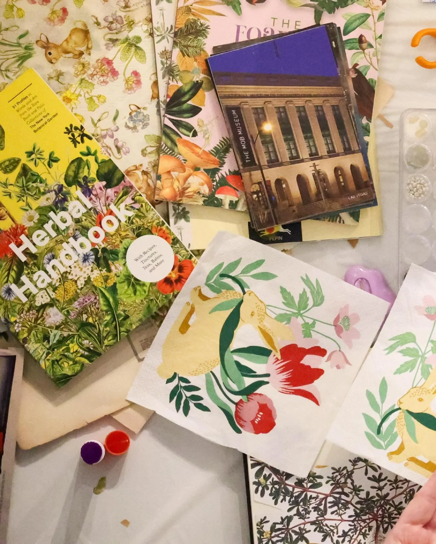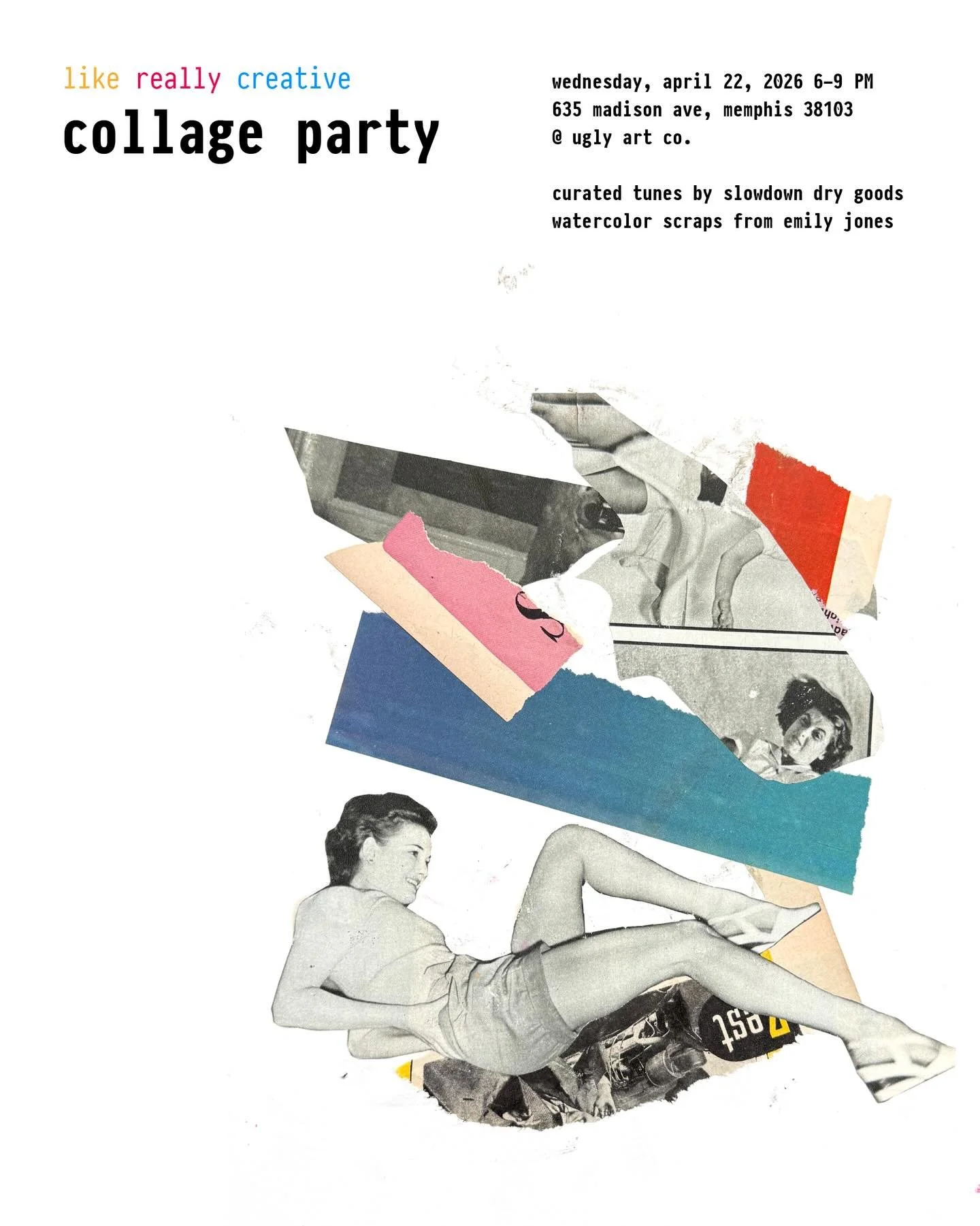 Slow down at the Like Really Creative April 22 Collage Party at The Ugly Art Co. with curated tunes by Slowdown Dry Goods and watercolor scraps provided by Emily Jones.