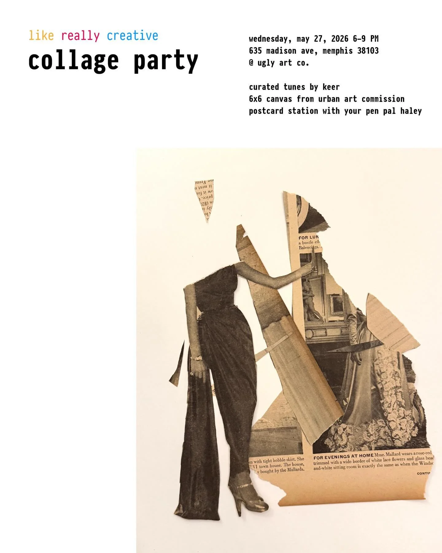 From canvas to postcards, expand your horizons at the May Collage Party with curated tunes by Keer, 6×6 canvas provided by Urban Art Commission for Canvas for a Cause Art Show, and a Snail Mail Postcard Station with Your Pen Pal Haley.